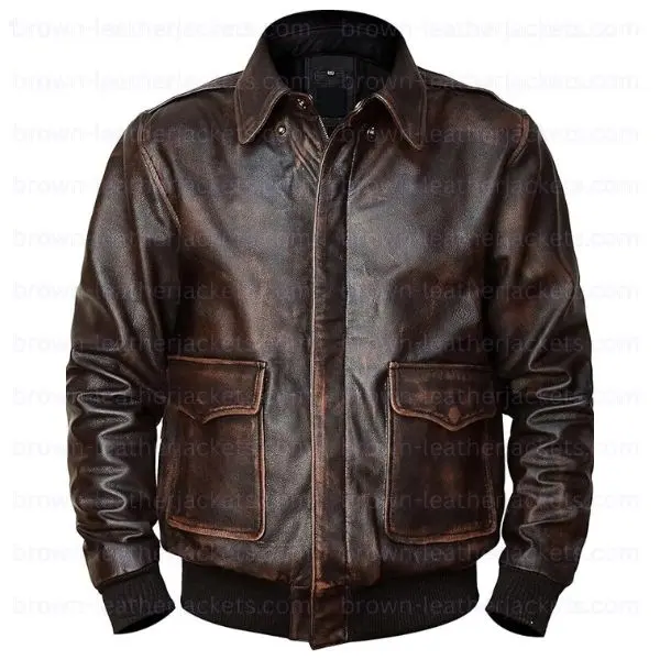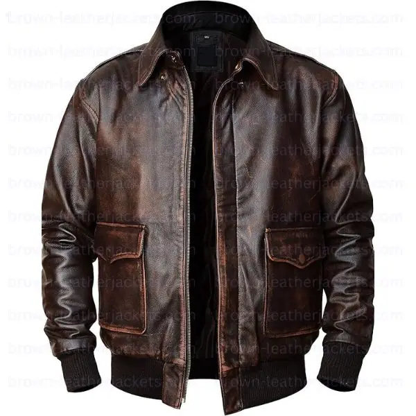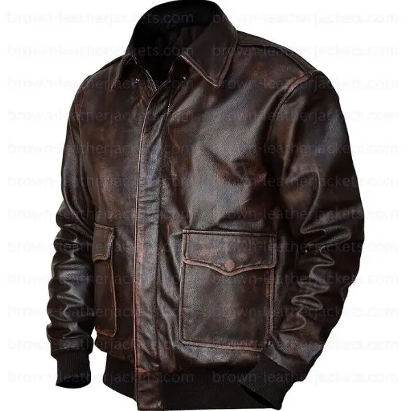 Brown A2 Flight Pilot bomber jacket in degraded real leather for men. Quality materials leather, a collar that resembles a shirt with snaps, a disguised frontal zipper, 2 snap-flap patched compartments, epaulets, and knit cuffs, and the waistband in a coordinating color are all included in the presented tough and fashionable A-2 jacket. The A-2 flying outerwear was introduced in the early 1930s as an alternative to the A-1 design. It was first used by the US Military Air Corps. Among the most identifiable styles of vintage military leather clothing, today is the A-2 jacket, which enjoyed great popularity during World War II.