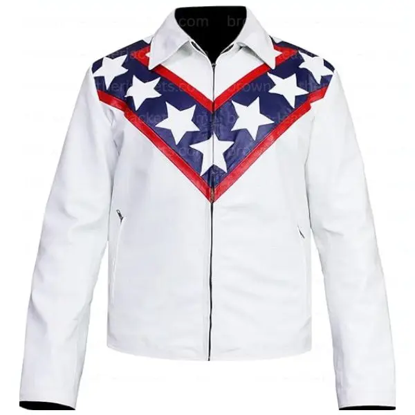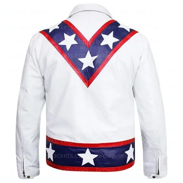 Bring back the young blood of America’s great daredevil with the Evel Knievel Stuntman Performer White Motorcycle Jacket. We have recreated the look of the legendary stuntman which has always been bold and very patriotic in style. Crafted from premium real leather or our very best in faux leather this piece brings together luxury and practicality for riders and fashion fans. We’ve got a soft viscose inner which sees to the comfort of the wearer and also we present a shirt style collar with a zipper front which gives the jacket a very classic, timeless biker look. Our jacket’s main feature is the white base with red and blue star design which we put in as a tribute to Evel Knievel’s fearless spirit and his affinity for high octane action. With its full length sleeves and large side pockets as well as inner pockets it is at once a fashion statement and a functional piece which you can wear on or off the road. If you’re into riding, collecting, or just classic American style that is a part of the past and present, this Evel Knievel stuntman jacket is a must have. A mix of the bold and the practical this jacket represents adventure, patriotism, and the classic stuntman image.