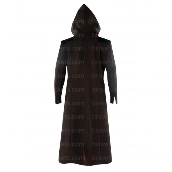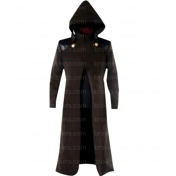 The leather coat is in a very dark black which weaves into the theme of mystery and power for Doom. It is a hooded long trench coat which also has an integrated hood, that which adds to the repelling charm, also the full length design includes dramatic touch. Front buttons and a hidden closure which play with metal clasps add a special touch of the film set to it. Also it has side pockets that are practical yet do not break the coat’s elegant look.