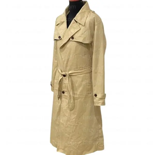 The back is characterized by a traditional button up design which also includes a belt at the waist for fit adjustment and to accentuate your shape. We see large lapel collars and open hem sleeves which bring a classic touch to the look and which also pay homage to the great Rick Blaine Casablanca style that has inspired many a fashion fan. This versatile beige sand colored classic trench coat is very much at home with any outfit, from a formal function to a casual night out.